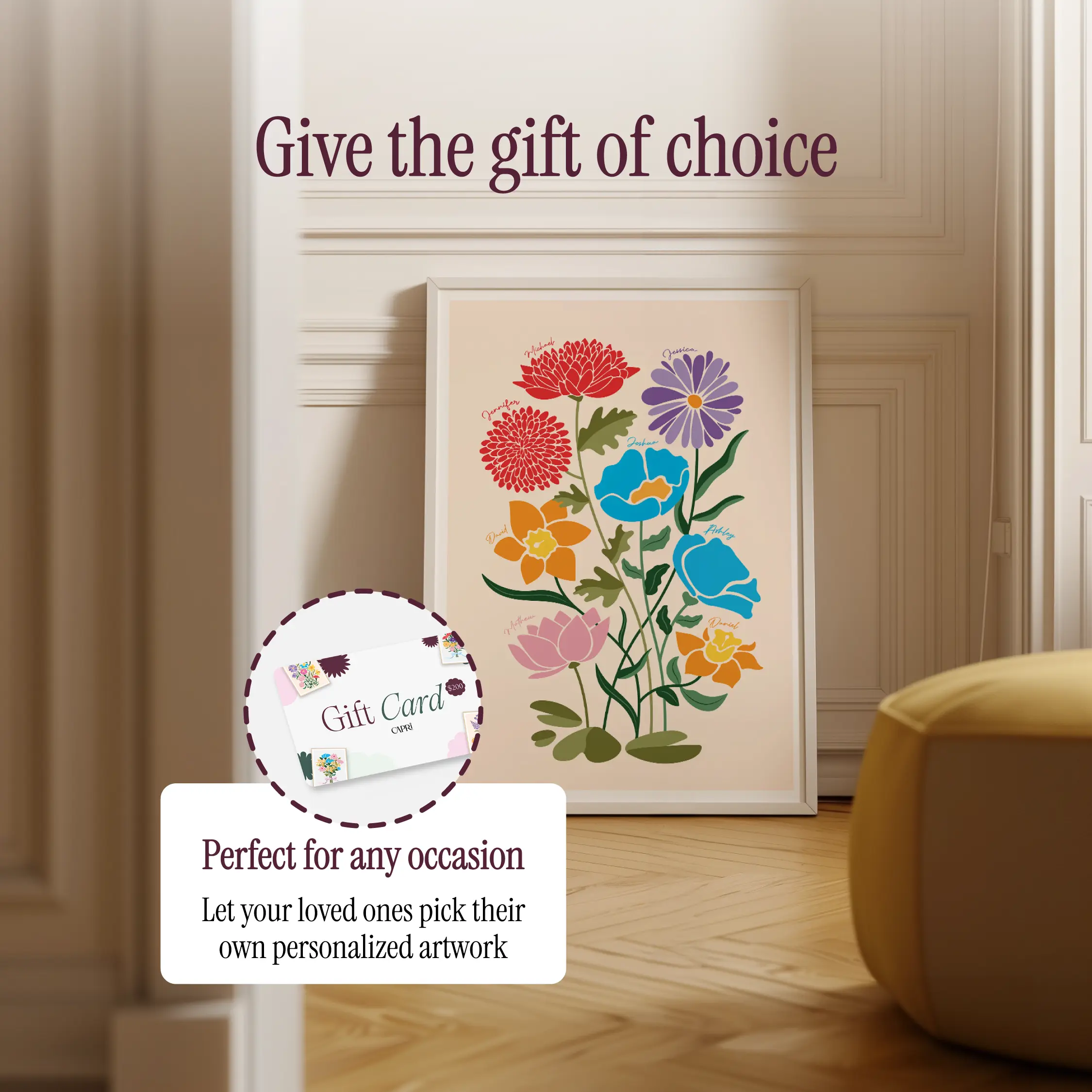 Give the gift of choice with a Capri Studios Gift Card. Perfect for any occasion, it lets your loved ones pick their own personalized artwork, ensuring a piece that truly speaks to them. Celebrate their unique story with the flexibility to choose the design they love most.